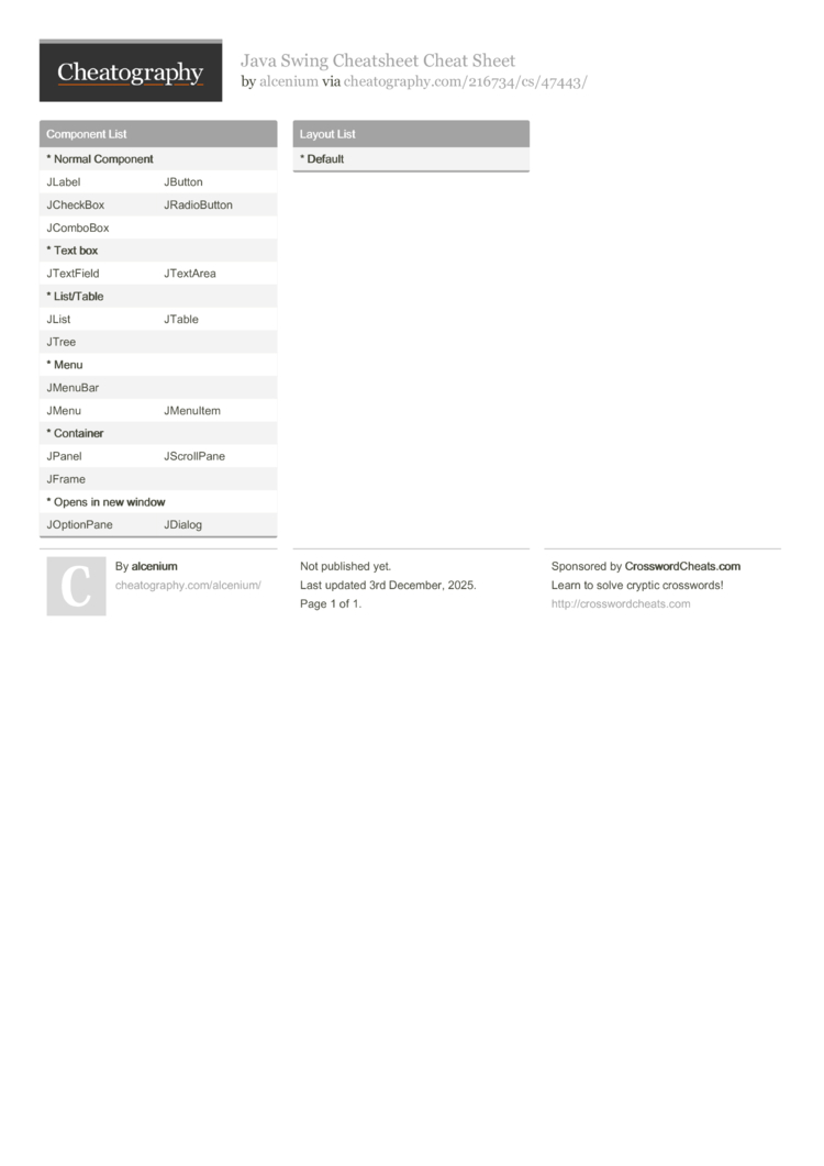 Java Swing Cheatsheet Cheat Sheet (DRAFT) by alcenium