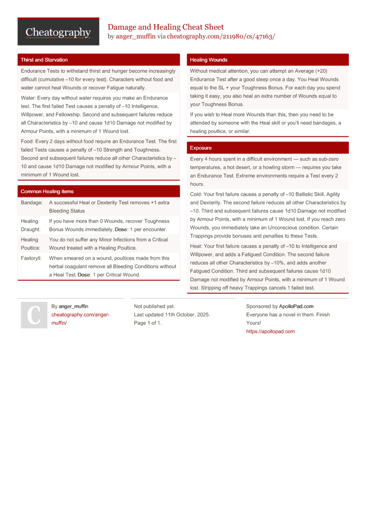 Without medical attention, you can attempt an Average (+20) Endurance Test after a good sleep once a day. You Heal Wounds equal to the SL + your Toughness Bonus. For each day you spend taking it easy, you also heal an extra number of Wounds equal to your Toughness Bonus. |