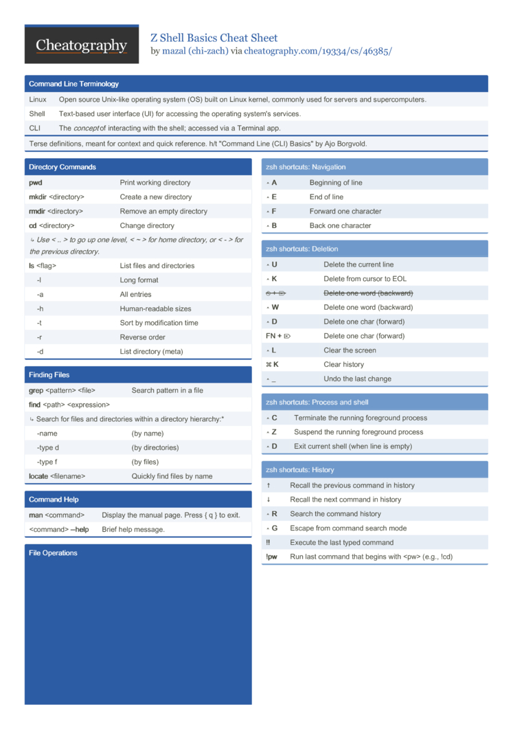 The Z Shell Basics cheatsheet is a quick reference for common Unix commands in the Zsh shell. Unix commands are core utilities, while a shell (like Zsh) is an interpreter that runs these commands. Zsh is a popular shell with enhancements over the traditional Bourne Shell (sh) and Bash.
