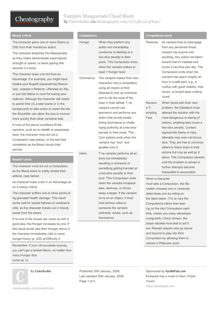 he vampire tries to disengage from any perceived threat, suspect ing anyone and anything. Any action not taken toward that im mediate end incurs a two-dice pen alty. The Compulsion ends when the vampire has spent roughly an hour in a safe spot: e.g., a rooftop with good visibility, their haven, or buried deep underground. |