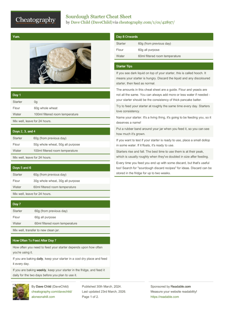 The amounts in this cheat sheet are a guide. Flour and yeasts are not all the same. You can always add more or less water if needed - your starter should be the consistency of thick pancake batter. |