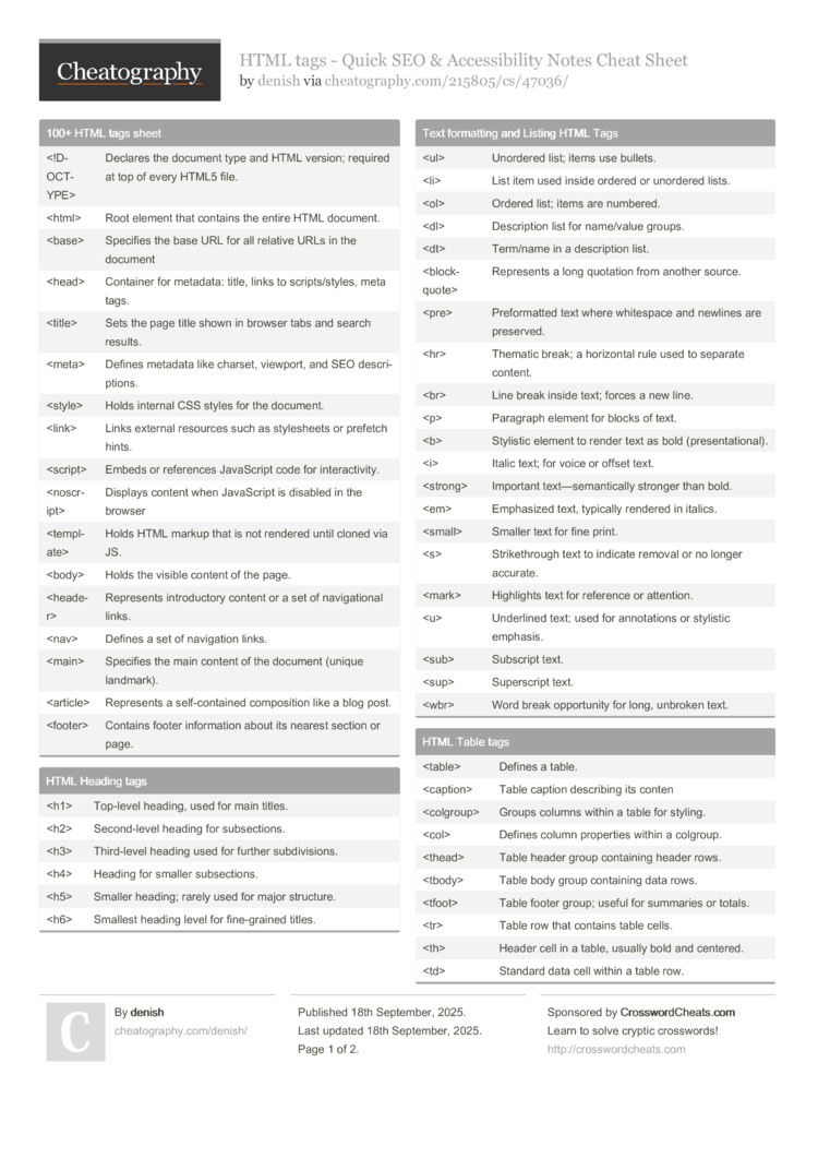 100+ HTML tags sheet