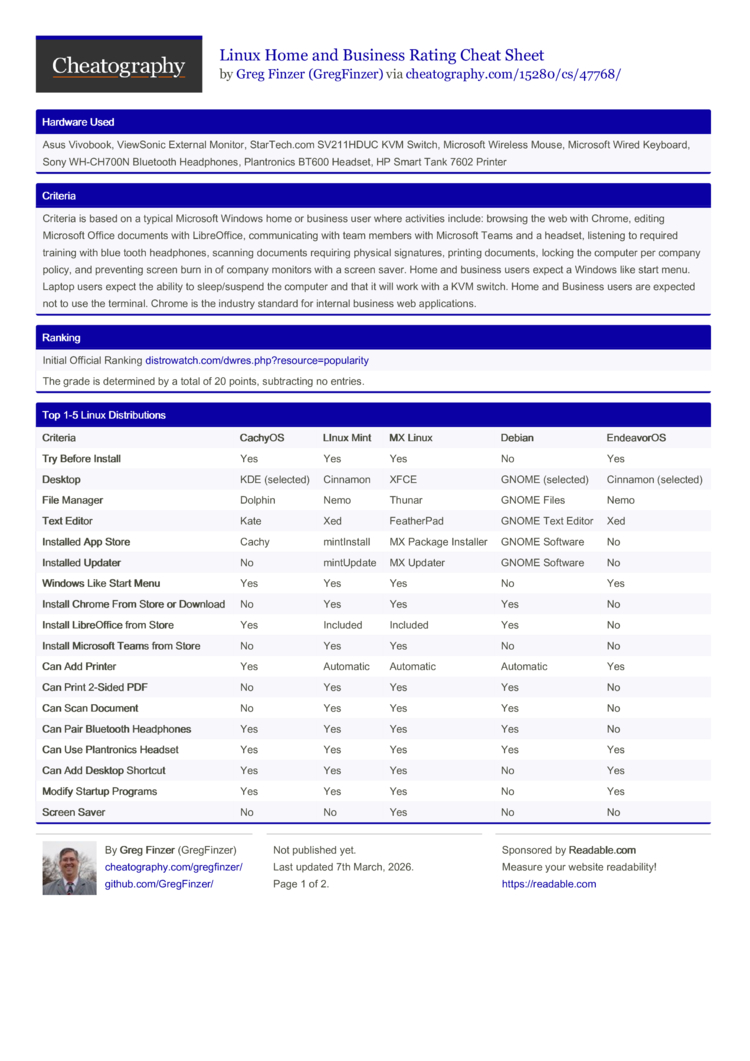 Criteria is based on a typical Microsoft Windows home or business user where activities include: browsing the web with Chrome, editing Microsoft Office documents with LibreOffice, communicating with team members with Microsoft Teams and a headset, listening to required training with blue tooth headphones, scanning documents requiring physical signatures, printing documents, locking the computer per company policy, and preventing screen burn in of company monitors with a screen saver. Home and business users expect a Windows like start menu. Laptop users expect the ability to sleep/suspend the computer and that it will work with a KVM switch. Home and Business users are expected not to use the terminal. Chrome is the industry standard for internal business web applications. |