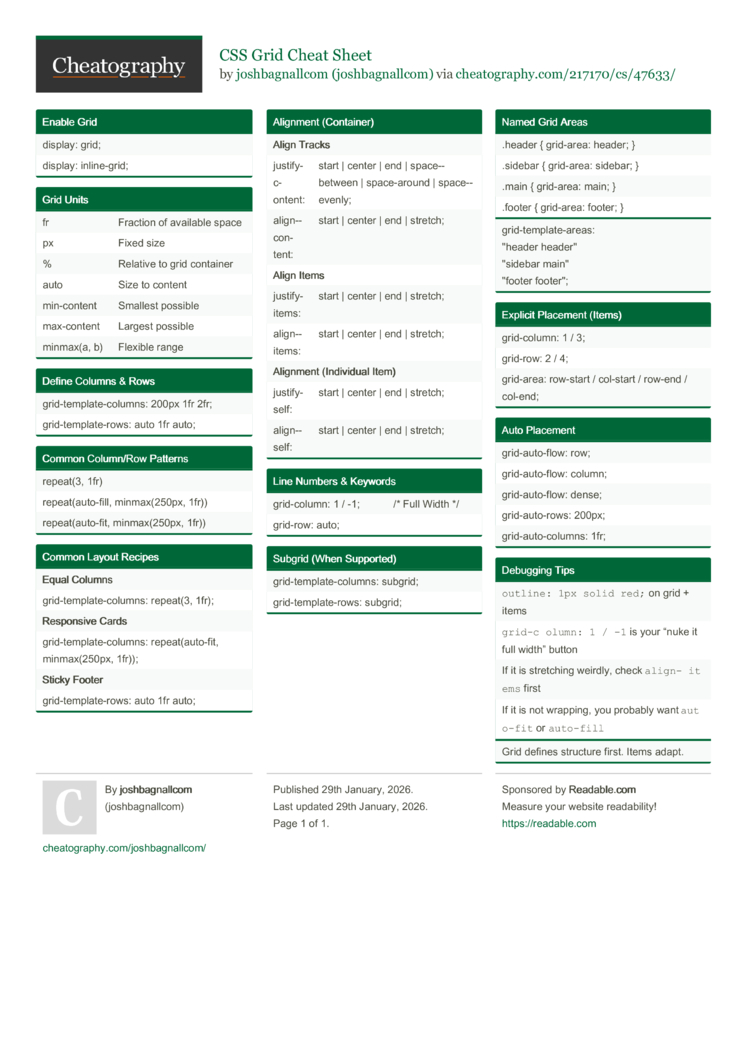 A one-page CSS Grid quick reference designed for real-world use. This cheat sheet distills the most commonly used Grid properties, patterns, and alignment rules into a compact, printable format. Ideal for developers who already understand Grid and just need a fast reminder while building layouts.