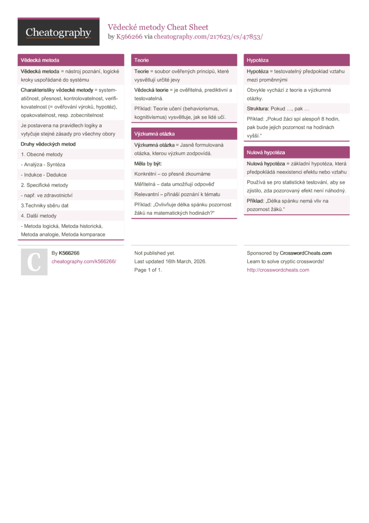 Charakteristiky vědecké metody = systematičnost, přesnost, kontrolovatelnost, verifikovatelnost (= ověřování výroků, hypotéz), opakovatelnost, resp. zobecnitelnost |