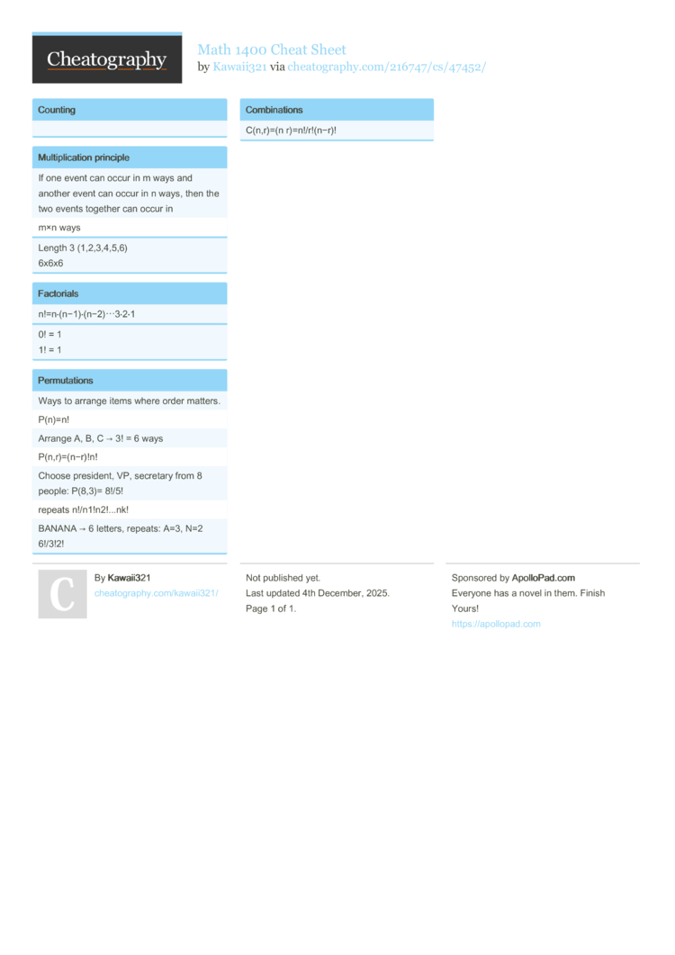 Math 1400 Cheat Sheet (DRAFT) by Kawaii321