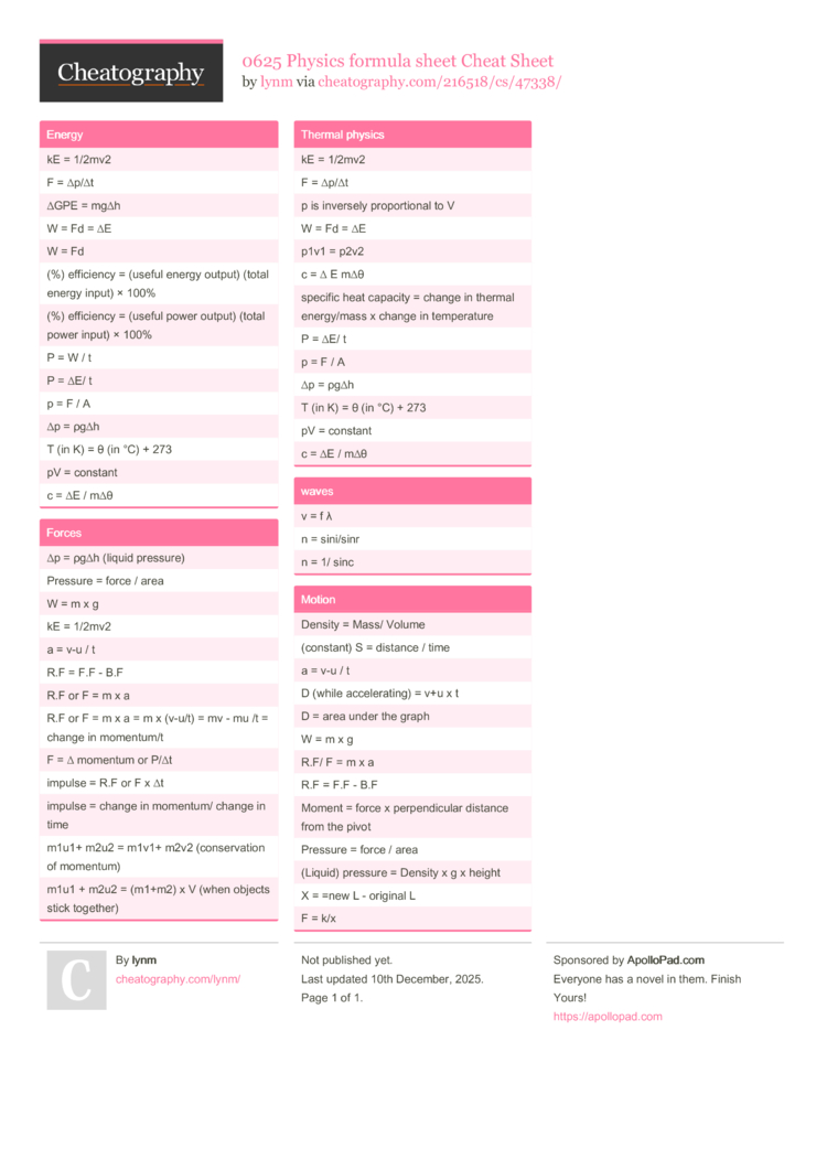 0625 IGCSE physics formulas updates every 2 weeks with a new chapter