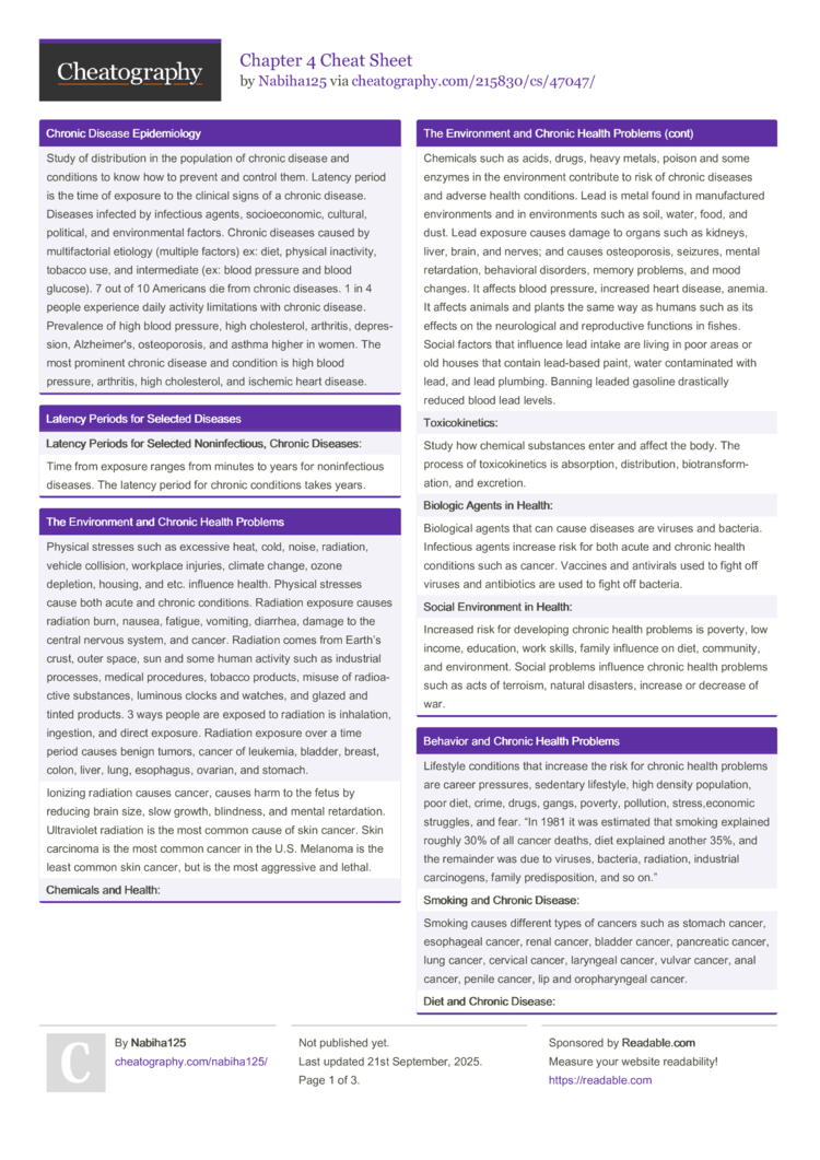 Study of distribution in the population of chronic disease and conditions to know how to prevent and control them. Latency period is the time of exposure to the clinical signs of a chronic disease. Diseases infected by infectious agents, socioeconomic, cultural, political, and environmental factors. Chronic diseases caused by multifactorial etiology (multiple factors) ex: diet, physical inactivity, tobacco use, and intermediate (ex: blood pressure and blood glucose). 7 out of 10 Americans die from chronic diseases. 1 in 4 people experience daily activity limitations with chronic disease. Prevalence of high blood pressure, high cholesterol, arthritis, depression, Alzheimer's, osteoporosis, and asthma higher in women. The most prominent chronic disease and condition is high blood pressure, arthritis, high cholesterol, and ischemic heart disease. |