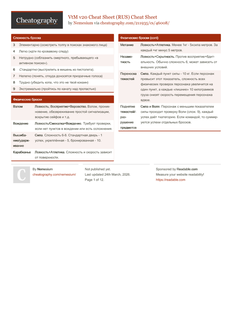 Сила/Манипулярование+Запугивание. Против Воли жертвы (если скрыто, слож.6). Против Силы+Запугивания или Воли жертвы (если активно; смотря что больше). |