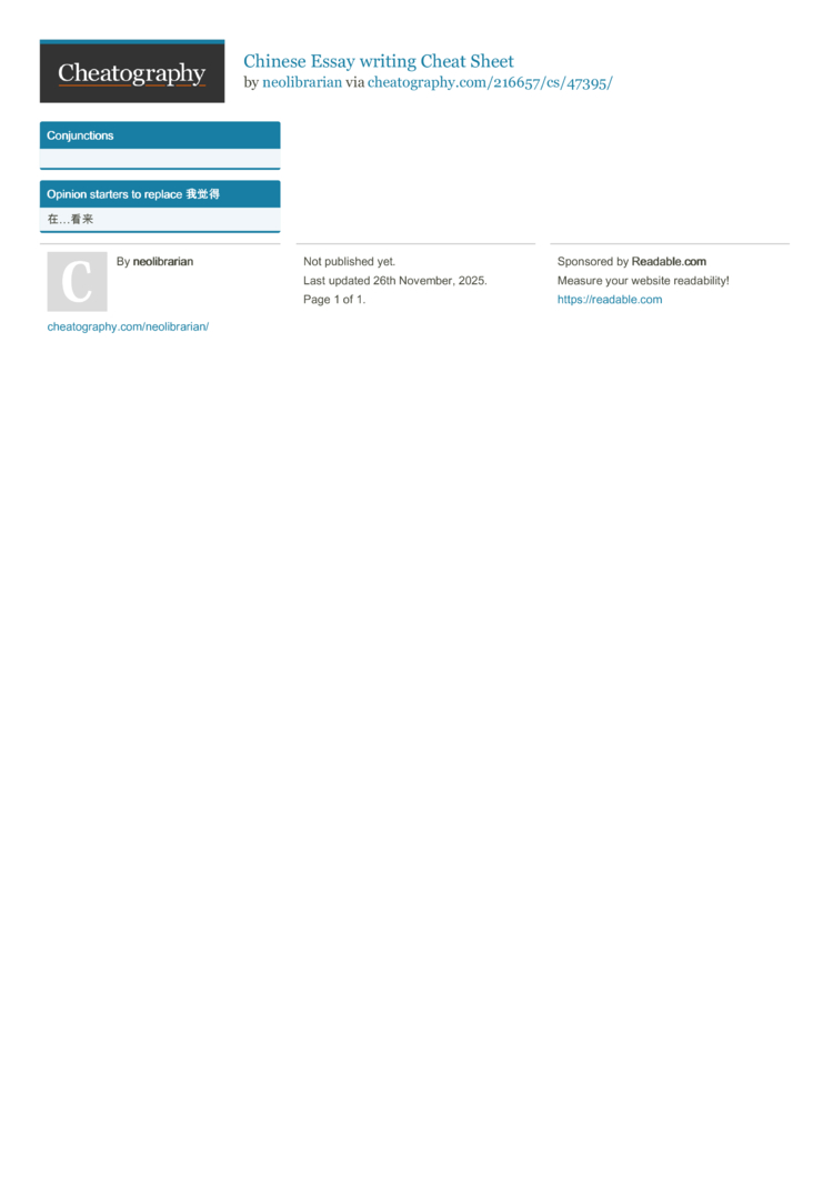 Chinese Essay writing Cheat Sheet (DRAFT) by neolibrarian
