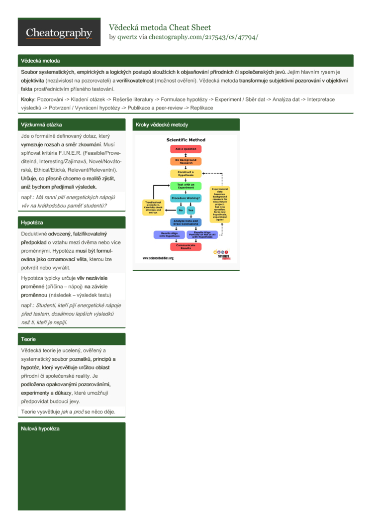 Kroky: Pozorování -> Kladení otázek -> Rešerše literatury -> Formulace hypotézy -> Experiment / Sběr dat -> Analýza dat -> Interpretace výsledků -> Potvrzení / Vyvrácení hypotézy -> Publikace a peer-review -> Replikace |