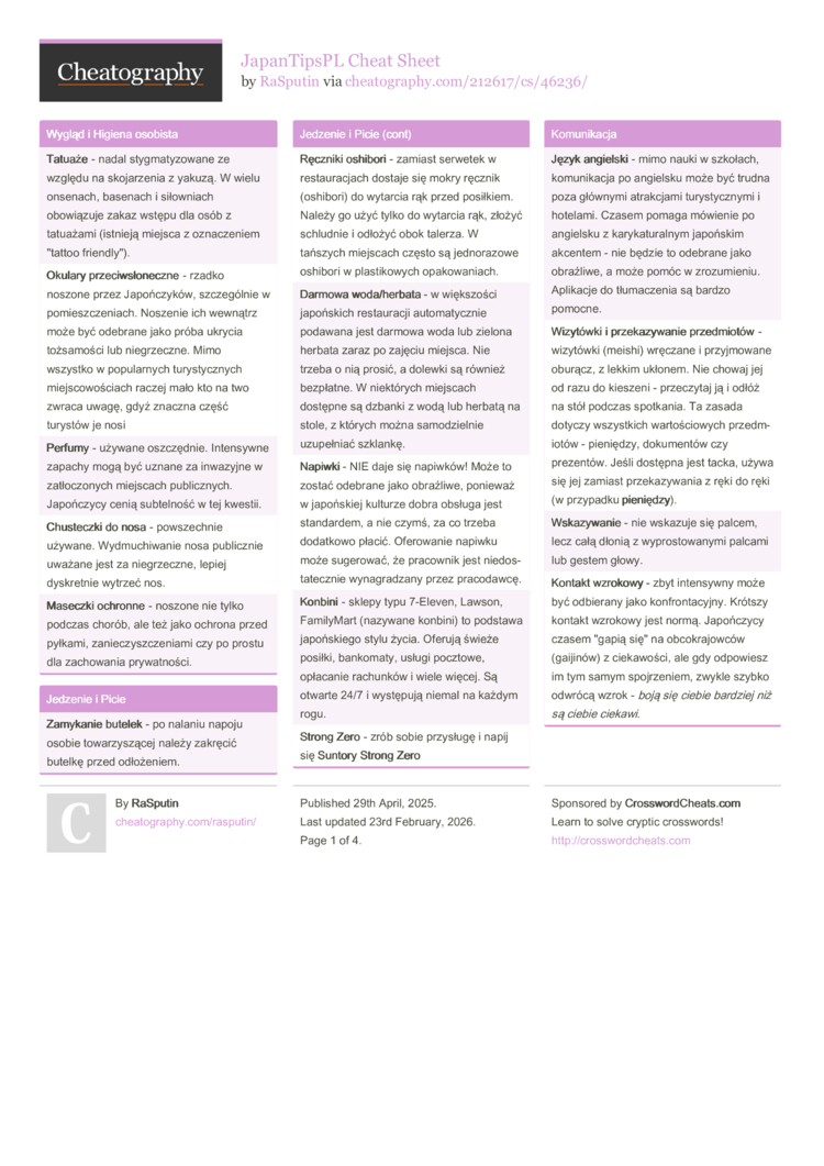 Kultura picia - Japonia jest krajem bardzo przyjaznym dla miłośników alkoholu – picie nawet w miejscach publicznych jest zazwyczaj tolerowane, a alkohol dostępny jest w konbini, automatach vendingowych i wszędzie indziej. Warto jednak pamiętać o zachowaniu umiaru i nieprzysparzaniu kłopotów innym – głośne czy agresywne zachowanie pod wpływem alkoholu jest źle widziane. Japończycy rzadko odmawiają drinka w towarzystwie biznesowym lub towarzyskim (istnieje nawet powiedzenie nomunication, czyli budowanie relacji przy piwie). |