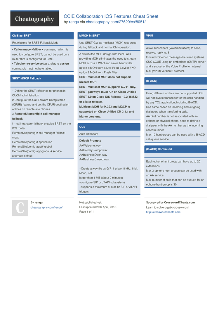 CCIE Collaboration IOS Features Cheat Sheet (DRAFT) by rengu