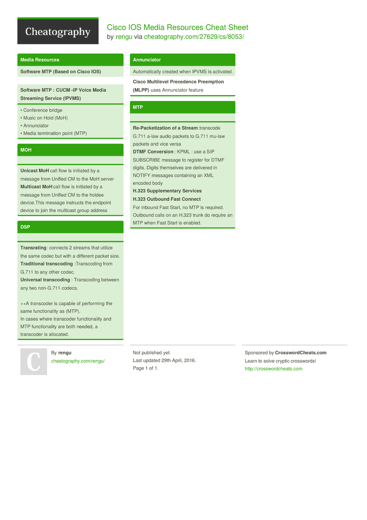 Cisco IOS Media Resources Cheat Sheet (DRAFT) by rengu