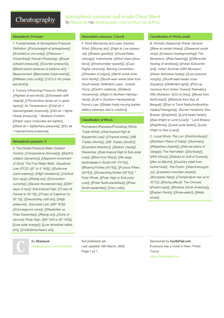 1. Fundamentals of Atmospheric Pressure Definition: [{Force/weight of atmosphere}], [{Exerted on unit area}], [{Pressure = Force/Area}]. Human Physiology: [{Equal outward pressure}], [{Counter-pressure}], [{Blood exerts pressure to balance air}]. * Measurement: [{Barometer (instrument)}], [{Millibars (mb) (unit)}], [{1013.2 mb (mean sea level)}]. |