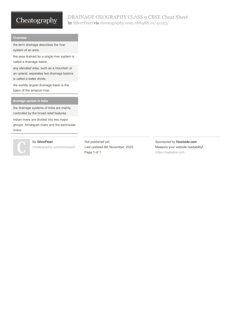 DRAINAGE GEOGRAPHY CLASS 9 CBSE Cheat Sheet (DRAFT) by SilverPearl