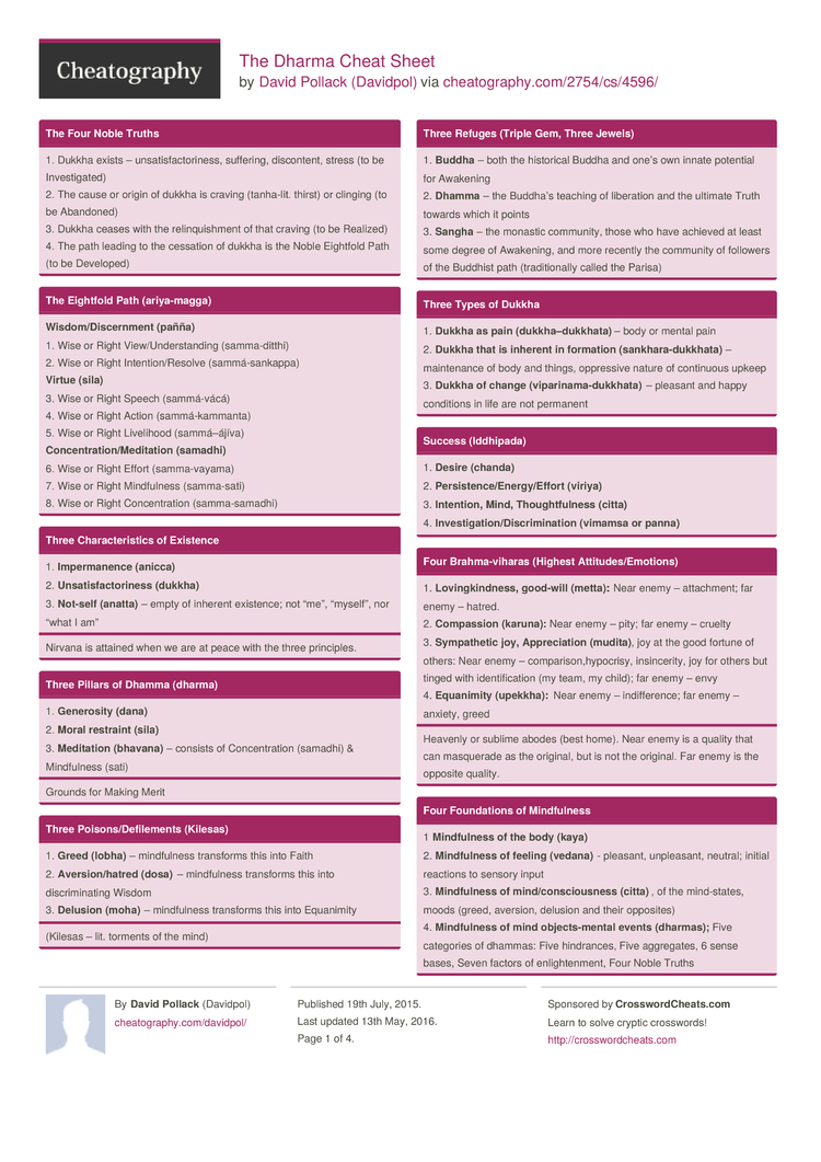 4. Mindfulness of mind objects-mental events (dharmas); Five categories of dhammas: Five hindrances, Five aggregates, 6 sense bases, Seven factors of enlightenment, Four Noble Truths |